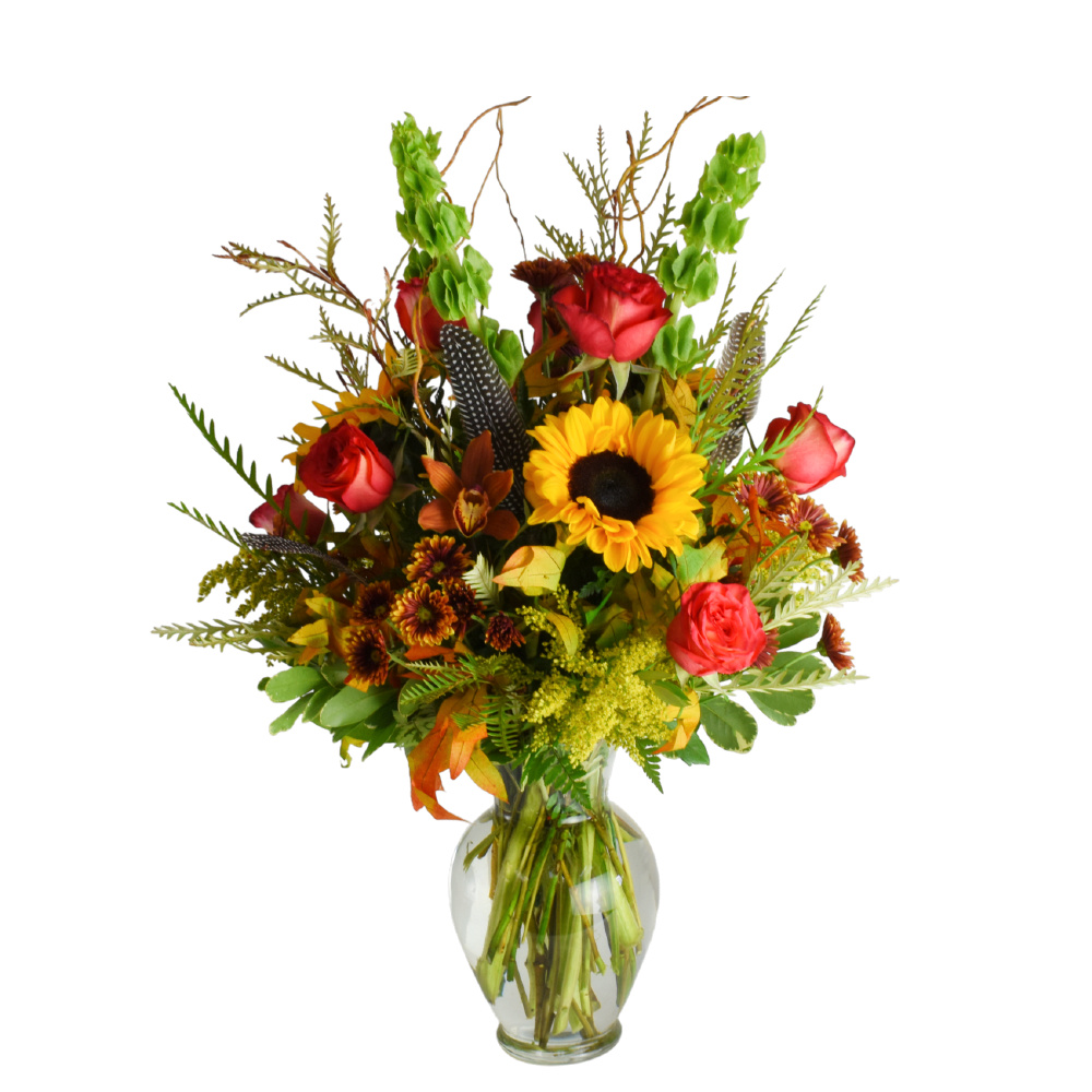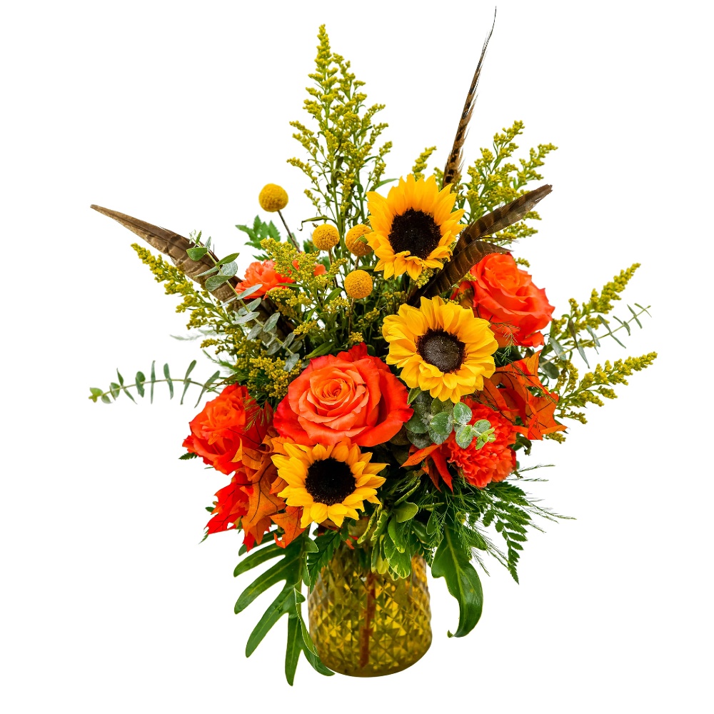 At Scent & Violet we hunt for flowers, and vases. Occasionally, we will stumble upon a bone or a feather and use it in our floral designs. This fun vase combines fiery roses, fiery vase, super bright sunflowers and feathers (no bones)