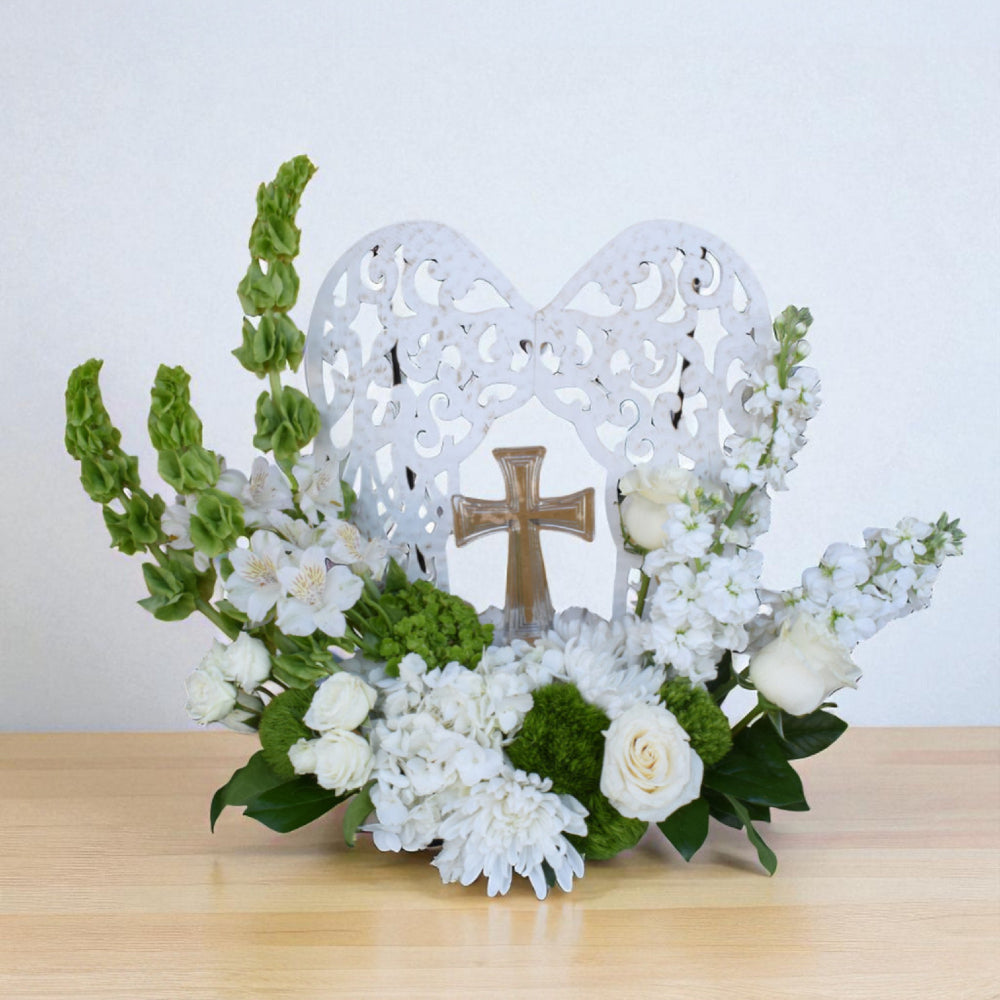 Going Home is a signature sympathy design combining a crystal cross and metal filigree angel wings framed by lush white and green flowers.